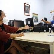Mer­ce­des Blat (al fon­do) atien­de a Caro­li­na Díaz en la sede del pro­yec­to Fent Lla­vor. Foto: A. Sáiz/AVAN