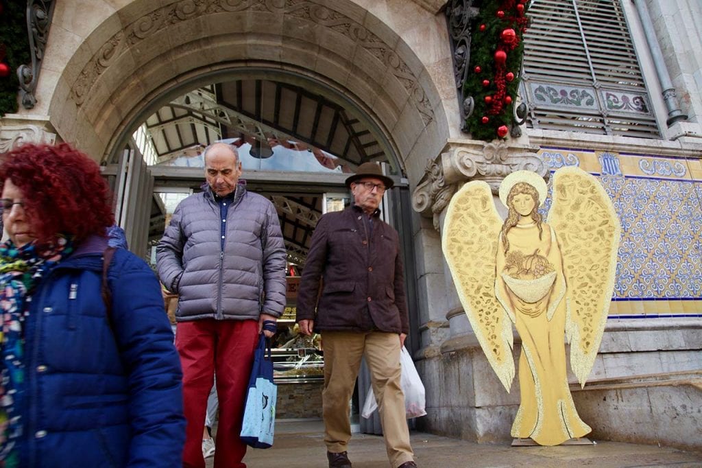 En la puerta situada frente a la Lonja, dos grandes ángeles muestran en sus alas las frutas y verduras que se venden en este recinto. En el interior, cuatro grandes caminos de tul rojo, situados en el techo de los pasillos principales, conducen, desde las entradas, a la gran estrella que preside el Belén.