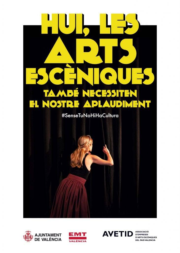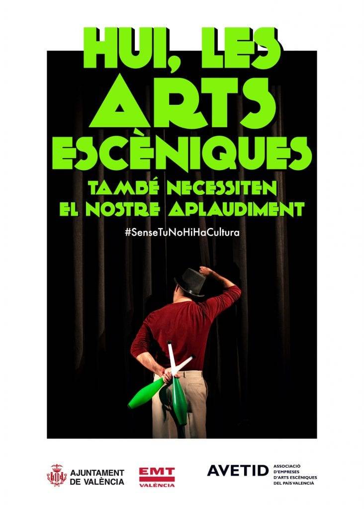 La Asso­cia­ció d’Empreses d’Arts Escè­ni­ques del País Valen­cià  (AVETID) ha cola­bo­ra­do con el Ayun­ta­mien­to en una ini­cia­ti­va que bus­ca la com­pli­ci­dad de los valen­cia­nos bajo el lema “Hoy las artes escé­ni­cas tam­bién nece­si­tan nues­tro aplau­so”.
