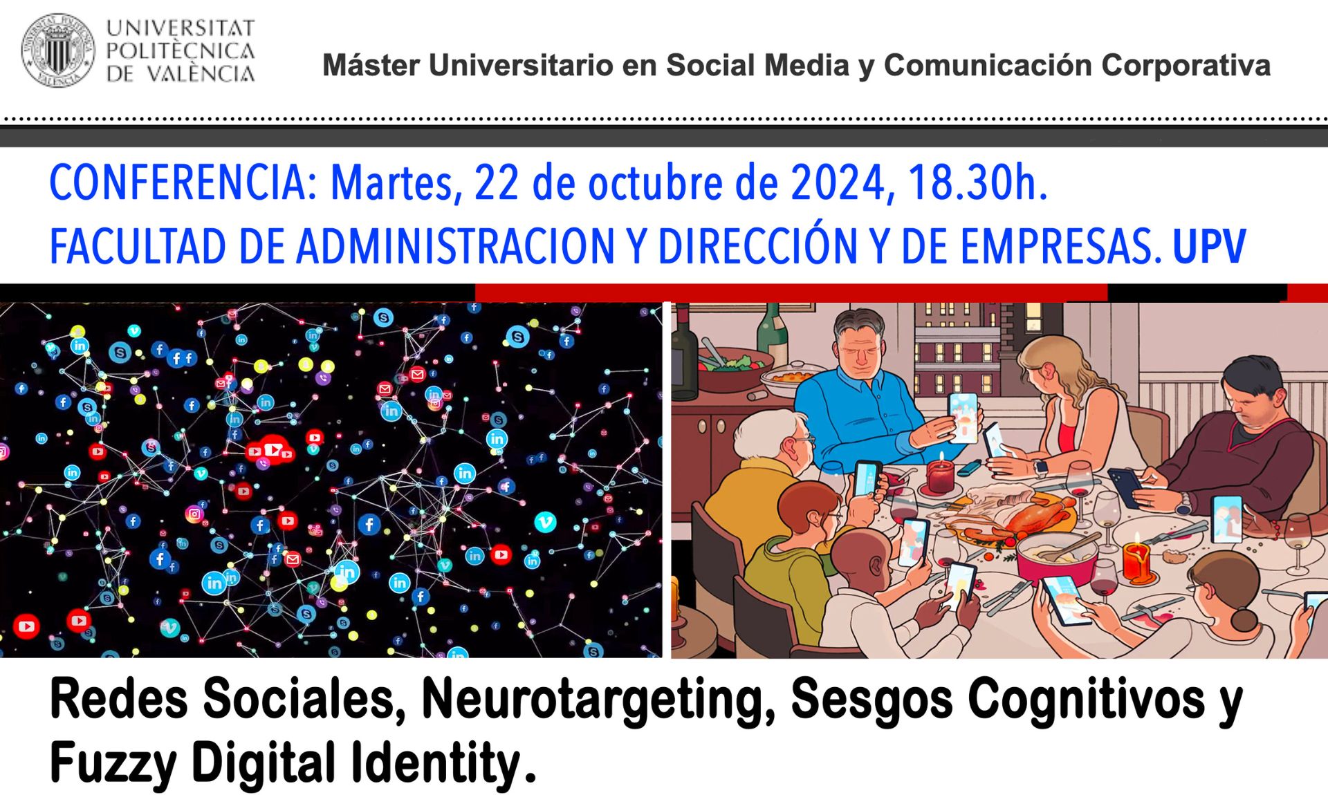 El periodista y escritor de ciencia y tecnología, a su vez que columnista habitual de esta casa, Adolfo Plasencia, impartirá la conferencia titulada “Redes sociales, neurotargeting, sesgos cognitivos y Fuzzy Digital Identity” el próximo martes 22 de octubre a las 18:30 h. en la Facultad de Administración y Dirección de Empresas de la UPV. La conferencia la imparte en el marco del Master Universitario en Social Medía y Comunicación Corporativa.