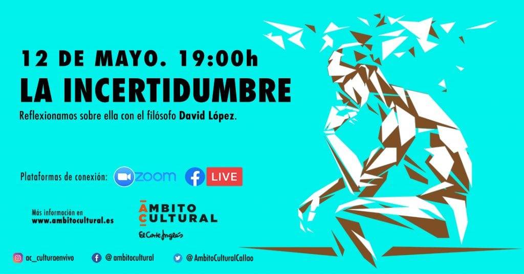 El martes 12 de mayo le toca el turno a la filosofía. En esta ocasión, David López reflexiona sobre la incertidumbre. Bajo el título “Reflexiones filosóficas sobre la incertidumbre en tiempos del coronavirus”, este gran filósofo nos hablará sobre el concepto de la incertidumbre en estos tiempos, que la crisis del Covid-19 ha elevado a categoría de concepto fundamental en nuestra civilización. Reflexionará sobre obras de autores como como Wittgenstein, Bergson, Nietzsche, Schopenhauer y Novalis, y también sobre varios libros descomunales, entre ellos el I Ching, o libro de los cambios, crucial en la civilización de la China antigua. Al terminar la conferencia, habrá unos 15 minutos para poder chatear con el folósofo en directo. Para más información: https://ambitocultural.es/reflexiones-filosoficas-incertidumbre-coronavirus-86390/