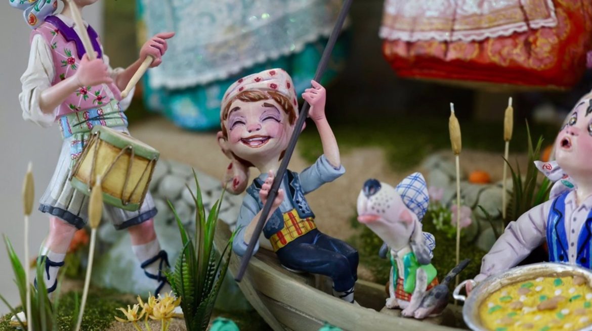 El conjunto evoca un Día de Pascua en La Albufera y presenta a falleras y falleros en este paraje natural, con elementos típicos de esa festividad y de la cultura valenciana, como una barca, un naranjo, una paella o monas de Pascua.