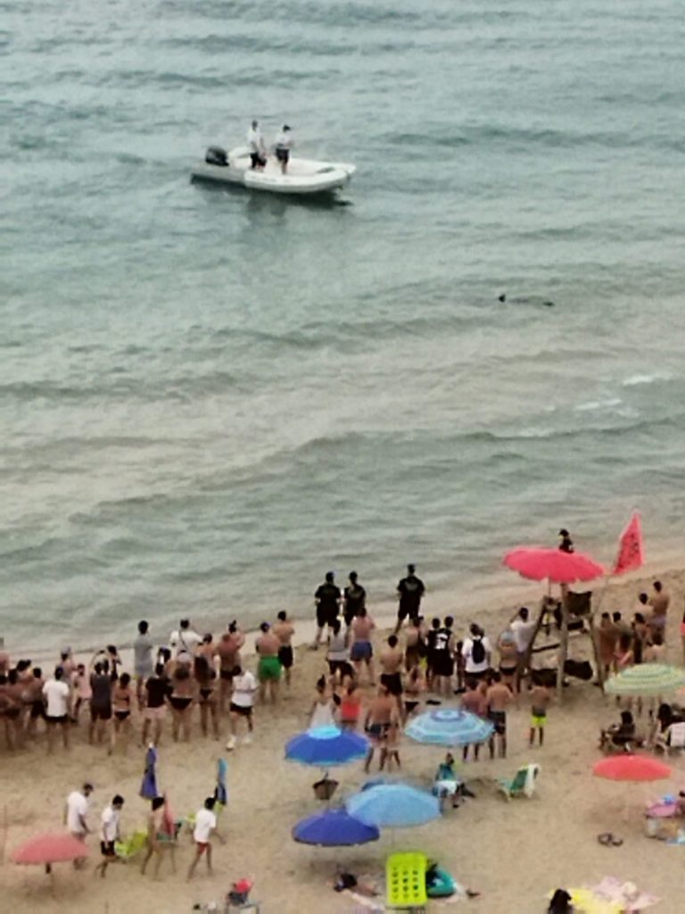 Los bañistas que se encontraban esta mañana en la playa de Benidorm tuvieron que salir tras avistarse un ejemplar de tiburón azul, también conocido como tintorera, muy cerca de la arena. Como se puede ver en las imágenes que acompañan esta noticia, tomadas por Martina, una joven valenciana de 9 años, ante el asombro propio y de su familia, la tintorera se ha paseado, tranquilamente, por la costa de Benidorm mientras que los bañistas trataban de observarla desde la seguridad de la arena y los servicios de emergencia intentaban alejarla de la costa.