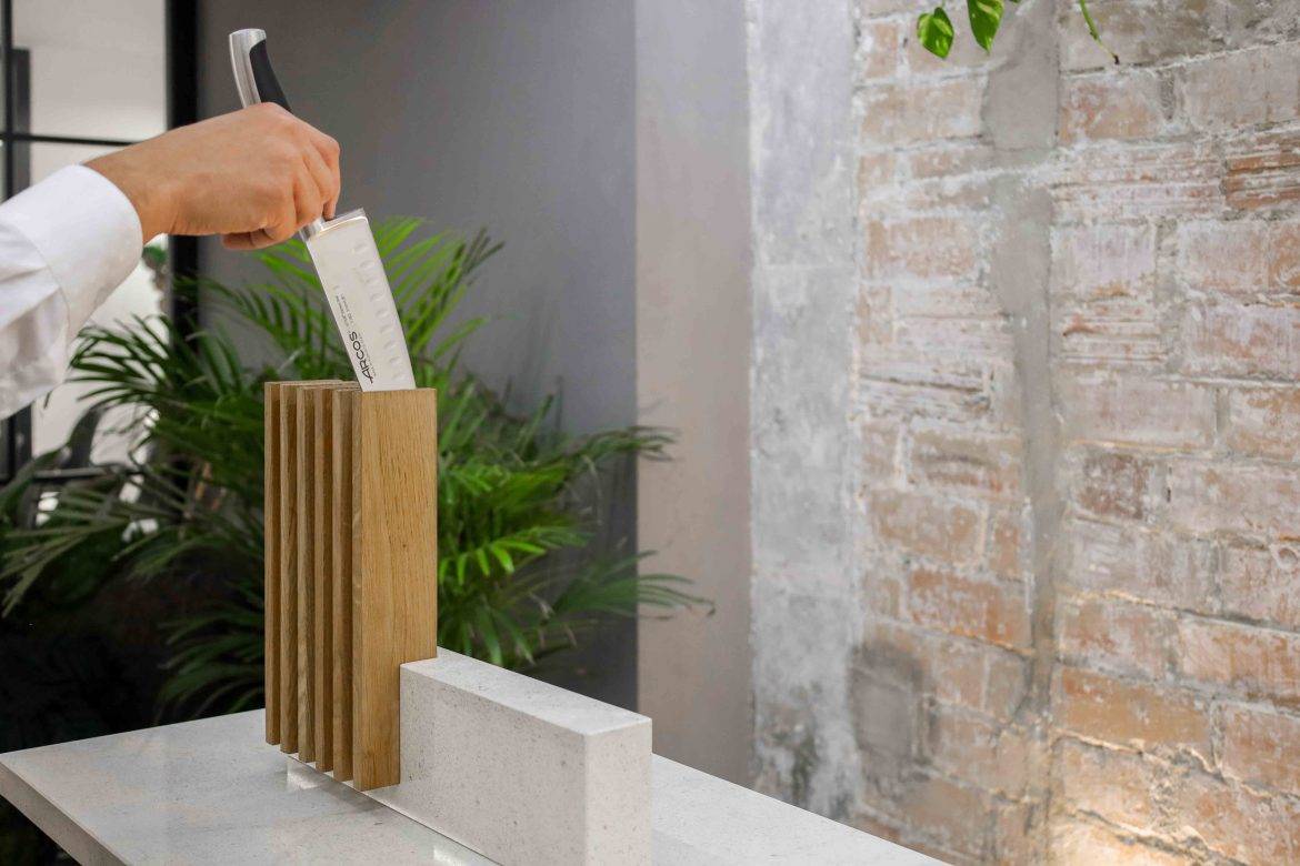 Piedra y madera forman un conjunto ideado para proteger y exponer, con una mezcla de sencillez y delicadeza, los cuchillos en nuestras casas. Como dice Begoña Rodrigo, «ahora recibimos de manera distinta, la cocina ha dejado de ser un sitio de uso, para ser un espacio de encuentro. Es importante que todo lo que haya en ella sume».