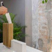 Piedra y madera forman un conjunto ideado para proteger y exponer, con una mezcla de sencillez y delicadeza, los cuchillos en nuestras casas. Como dice Begoña Rodrigo, «ahora recibimos de manera distinta, la cocina ha dejado de ser un sitio de uso, para ser un espacio de encuentro. Es importante que todo lo que haya en ella sume».