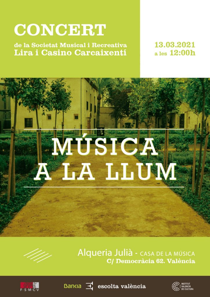 La campanya “Música a la Llum — Concerts a la Casa de la Música”, organitzada per Bankia, amb la col·laboració de la Federació de Societats Musicals de la Comunitat Valenciana (FSMCV) i l’Institut Valencià de Cultura (IVC), arrancarà aquest dissabte 13 de març a la Casa de la Música — Alqueria Julià, al carrer Democràcia, 62 de València.