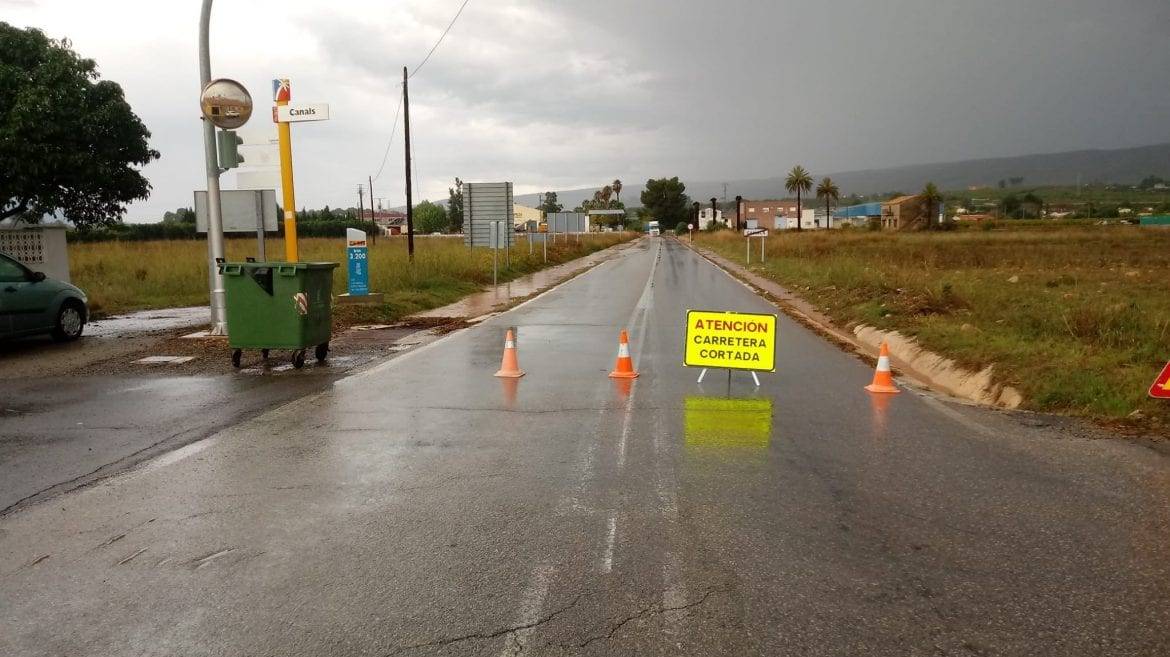 Las fuertes lluvias y sus consecuencias han obligado a cerrar multitud de carreteras en toda la comunidad valenciana como esta a la entrada de Canals, en La Costera.