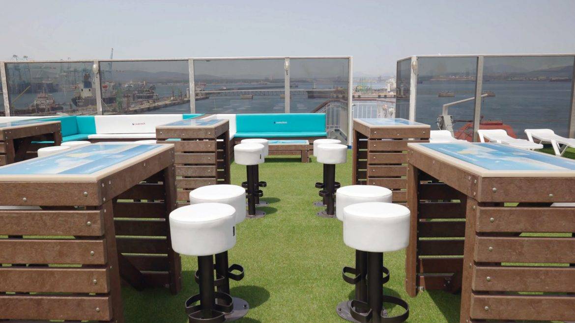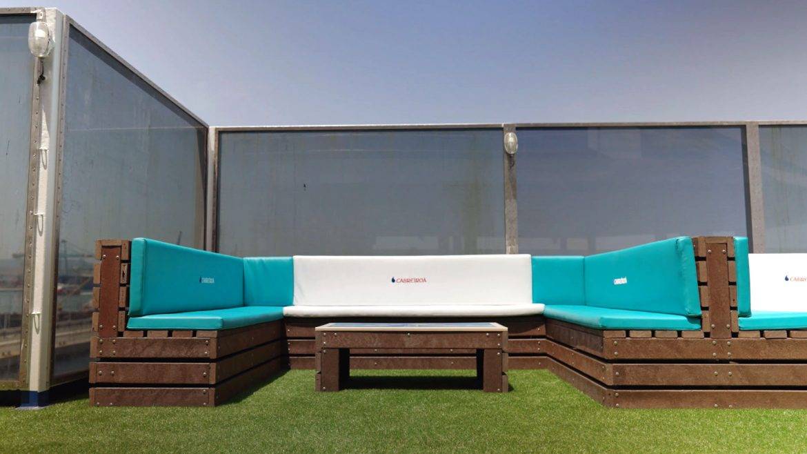 Baleària y Cabreiroá han reciclado más de 7.000 kg de plástico para crear mesas, sillas y bancos destinados a las terrazas exteriores de algunos barcos de la naviera, como el Abel Matutes y más recientemente el Martín i Soler, que además navegan a gas natural, un combustible más limpio.