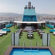 Baleària y Cabreiroá han reciclado más de 7.000 kg de plástico para crear mesas, sillas y bancos destinados a las terrazas exteriores de algunos barcos de la naviera, como el Abel Matutes y más recientemente el Martín i Soler, que además navegan a gas natural, un combustible más limpio.