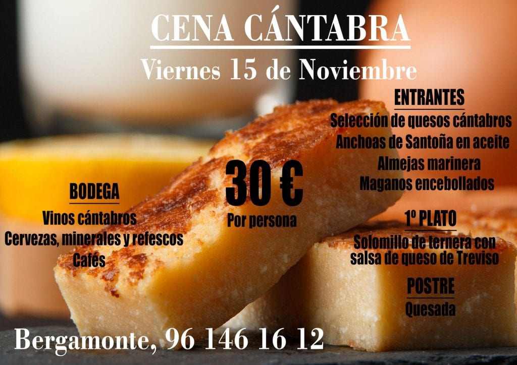 La propuesta cántabra arranca con unos entrantes compuestos por una selección de quesos cántabros, anchoas de Santoña en aceite, almejas a la marinera y unos típicos maganos encebollados. De ahí pasamos al plato fuerte de la noche. Para ello Bergamonte nos propone un sabroso solomillo de ternera con salsa de queso de Treviso. Una quesada será la encargada de poner el colofón del postre a la cena. El menú incluye una bodega de vinos cántabros —o en su caso cerveza, agua y refrescos — , así como café.