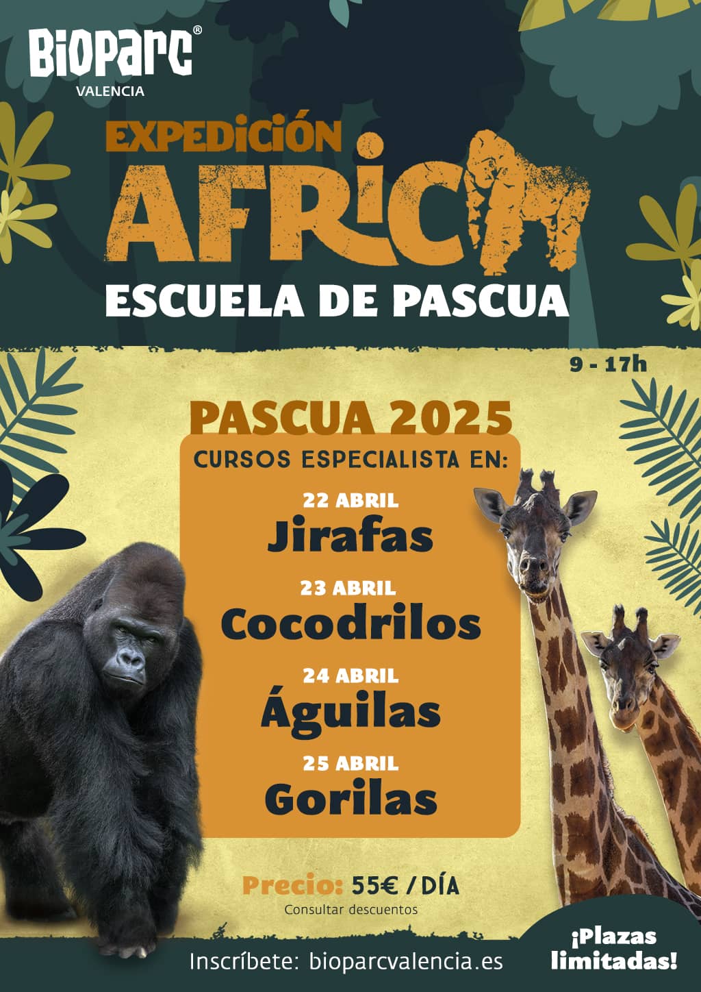 Las fechas de la pri­me­ra edi­ción de este año de la Escue­la de vaca­cio­nes de BIOPARC Valen­cia serán del 22 al 25 de abril, man­te­nien­do el for­ma­to de “Cur­sos de espe­cia­lis­ta en ani­ma­les” que faci­li­tan de for­ma mono­grá­fi­ca ahon­dar en el cono­ci­mien­to de algu­nas de las espe­cies más emble­má­ti­cas del par­que, en esta oca­sión, jira­fas, coco­dri­los, águi­las y gori­las. Diri­gi­do a par­ti­ci­pan­tes que hayan naci­do entre 2013 y 2019, “Expe­di­ción Áfri­ca” es una gran herra­mien­ta para cum­plir el obje­ti­vo del par­que, como es acer­car la belle­za de la vida sal­va­je a la socie­dad para moti­var un sen­ti­mien­to de pro­tec­ción hacia la natu­ra­le­za. Estas actua­cio­nes son espe­cial­men­te impor­tan­tes al orien­tar­se hacia el públi­co fami­liar para conec­tar direc­ta­men­te con la infan­cia quien, a su vez, tras­la­da esta valio­sa infor­ma­ción a su entorno más pró­xi­mo. BIOPARC se con­vier­te así en un espa­cio de divul­ga­ción y de edu­ca­ción medioam­bien­tal fun­da­men­tal.