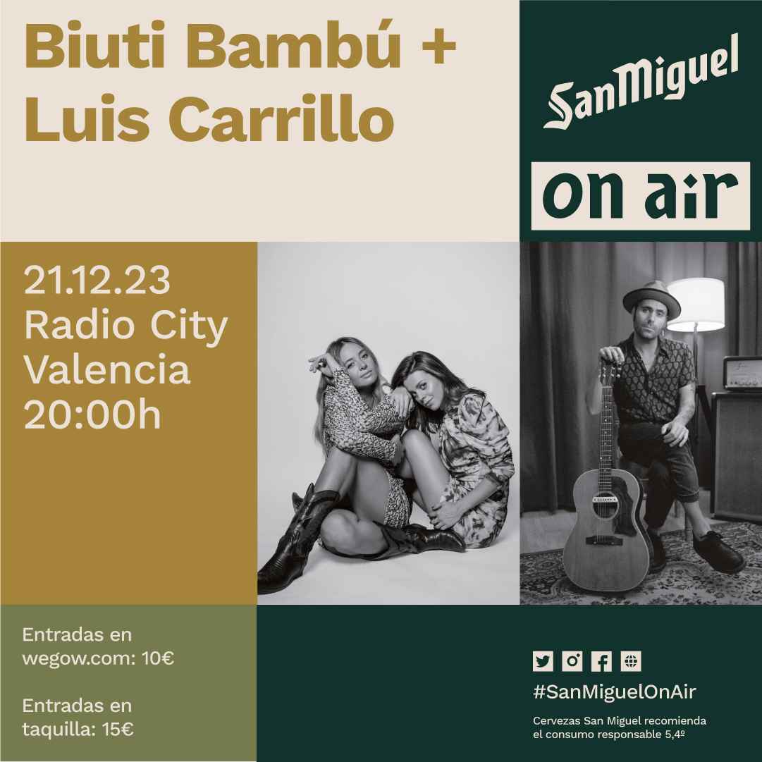 Cervezas San Miguel, en su compromiso por apoyar el circuito musical nacional a través de su proyecto San Miguel On Air, cierra esta última edición el próximo 21 de diciembre con el directo de Biuti Bambú y Luis Carrillo en la sala Radio City. El ciclo ya ha recorrido salas y bares de la ciudad como El Volander, George Best Club, 16 Toneladas, Electropura, Loco Club, Underland, o Kaf Kafé. Las entradas ya están a la venta aquí.