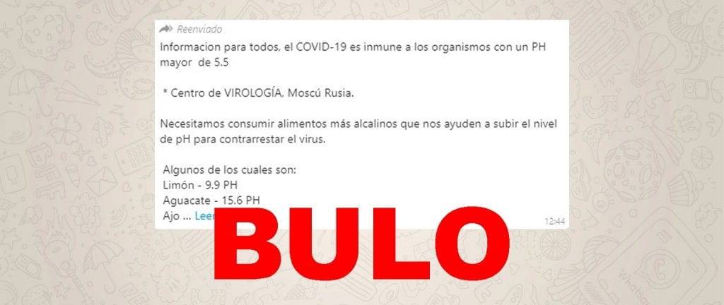Una cadena de WhatsApp atribuida al “centro de virología de Moscú, Rusia” asegura que “el COVID-19 es inmune a los organismos con un pH mayor de 5.5” y que por tanto hay que consumir alimentos alcalinos que nos ayuden a combatir el pH para contrarrestar el virus. En la cadena se dan algunos ejemplos como el limón, el aguacate, la piña o el mango. Es un bulo. Os lo explica la web especializada en fakes news Maldito Bulo: