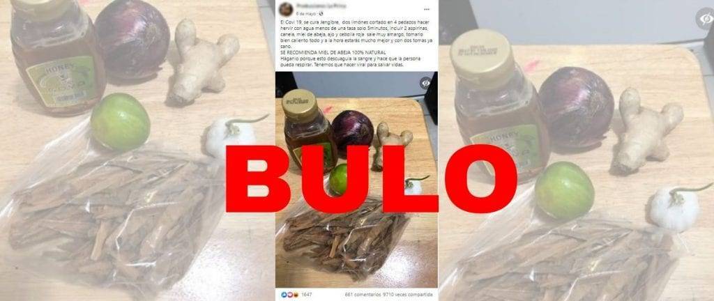 Des­de la lle­ga­da de la pan­de­mia de coro­na­vi­rus han cir­cu­la­do en varias oca­sio­nes supues­tos reme­dios case­ros fren­te al virus como bebi­das hechas a base de varios ali­men­tos. En esta oca­sión, el con­te­ni­do que se está com­par­tien­do dice que hay que her­vir jen­gi­bre, dos limo­nes cor­ta­dos en cua­tro tro­zos, dos aspi­ri­nas, cane­la, miel de abe­ja y cebo­lla roja y tomar­lo calien­te, pues “a la hora esta­rás mucho mejor y con dos tomas ya sano” (sic).
