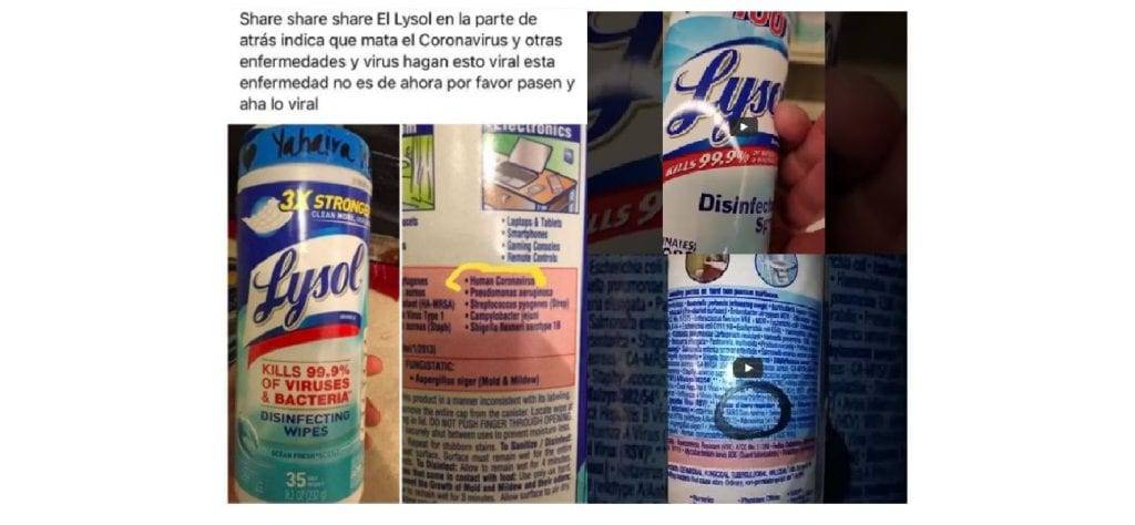 Esas publi­ca­cio­nes inclu­yen vídeos y fotos de varios pro­duc­tos de Lysol, en cuyas ins­truc­cio­nes pone que son efec­ti­vos para desin­fec­tar super­fi­cies infec­ta­das con coro­na­vi­rus humano, entre otros virus y bac­te­rias. Según las per­so­nas que las difun­den, eso demos­tra­ría que la cepa que ha cau­sa­do el bro­te actual no es nue­va y que inclu­so exis­ten pro­duc­tos para com­ba­tir­la.