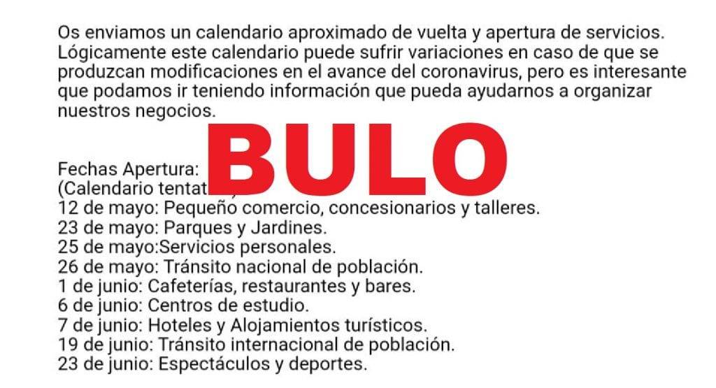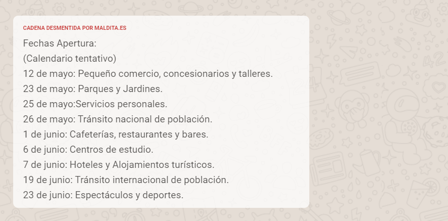 Se está vira­li­zan­do una cade­na de WhatsApp con las supues­tas fechas de aper­tu­ra de comer­cios y otros ser­vi­cios. Un calen­da­río que empe­za­ría el 12 de mayo con el “peque­ño comer­cio” y aca­ba­ría el 23 de junio con los “espec­tácu­los y depor­tes”. Estas fechas salen de un grá­fi­co que ya hemos des­men­ti­do y que es la opi­nión de 400 encues­ta­dos por una empre­sa del sec­tor de la auto­mo­ción, no unas fechas ofi­cia­les ni publi­ca­das por el Gobierno. Os lo expli­ca­mos.