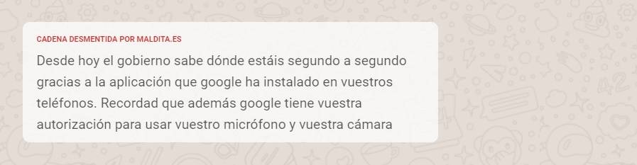 La acu­sa­ción al Gobierno es común, tan­to por haber ins­ta­la­do una supues­ta apli­ca­ción sin que lo sepa­mos, como por tener algo que ver con el sis­te­ma de “Noti­fi­ca­cio­nes de expo­si­ción al COVID-19” que apa­re­ce aho­ra en los telé­fo­nos con el sis­te­ma ope­ra­ti­vo Andro­id, de Goo­gle. Esta incor­po­ra­ción a los ser­vi­cios de Goo­gle se debe a una actua­li­za­ción que han pro­gra­ma­do Apple y Goo­gle para intro­du­cir una API (inter­faz de pro­gra­ma­ción de apli­ca­cio­nes) en nues­tro telé­fo­nos, pero no tie­ne nada que ver con nues­tro Gobierno. Te expli­ca­mos todo este pro­ce­di­mien­to en este artícu­lo.CADENA DESMENTIDA POR MALDITA.ESDesde hoy el gobierno sabe dón­de estáis segun­do a segun­do gra­cias a la apli­ca­ción que goo­gle ha ins­ta­la­do en vues­tros telé­fo­nos. Recor­dad que ade­más goo­gle tie­ne vues­tra auto­ri­za­ción para usar vues­tro micró­fono y vues­tra cáma­ra