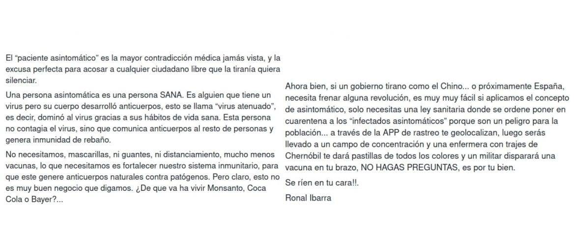 Tampoco es cierto que, como dice la cadena, las personas asintomáticas comuniquen los anticuerpos. “Los anticuerpos desgraciadamente no se comunican, transmitimos el virus”, añade Alcamí.