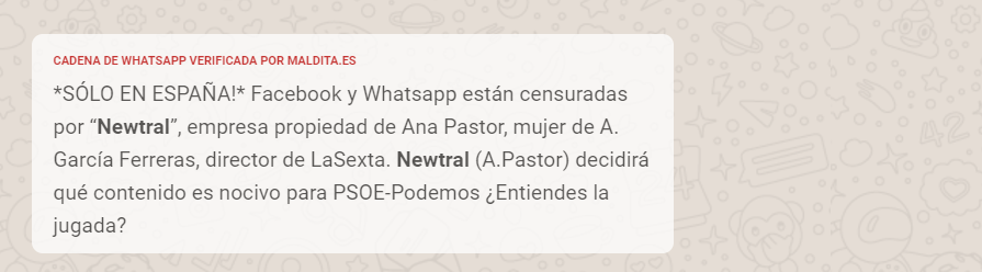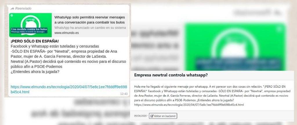 Se está viralizando una cadena que afirma que los contenidos de WhatsApp y Facebook están siendo censurados por Newtral, la startup de contenido audiovisual fundada por Ana Pastor, y que ésta decidirá que “contenido es nocivo para PSOE-Podemos” y que esto sólo pasa en España. Se añade, además, un link a un contenido de El Mundo que no dice eso. Es cierto que WhatsApp ha anunciado en un comunicado nuevas medidas a nivel mundial para limitar el reenvío de aquellos mensajes que ya han sido reenviados más de 5 veces y así “restringir la viralización” de algunos de ellos que podrían estar difundiendo desinformación, sobre todo en el contexto actual de emergencia de coronavirus. Concretamente, algunos mensajes sólo se van a poder reenviar a un chat y no a varios a la vez. Pero nada de esto tiene que ver con Newtral; no hay un control sobre los contenidos a los que WhatsApp limita su difusión. Según WhatsApp los mensajes en su plataforma están cifrados y nadie puede leerlos. Os lo explicamos.