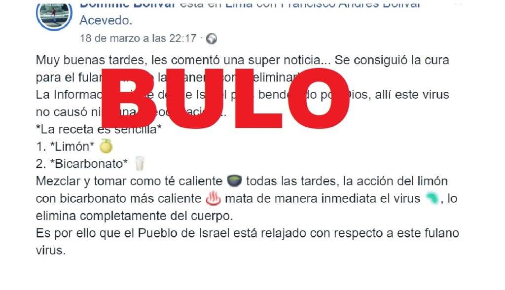 La web especializada en fake news Maldito Bulo ha alertado de una nueva “receta” falsa que circula en las redes sociales para combatir el coronavirus Covid-19. Se trataría de un té caliente con limón y bicarbonato. Se trata de un simple bulo ya que, como vienen alertando todas las autoridades sanitarias, ningún alimento previene, ni cura, ni elimina la infección de Covid-19.