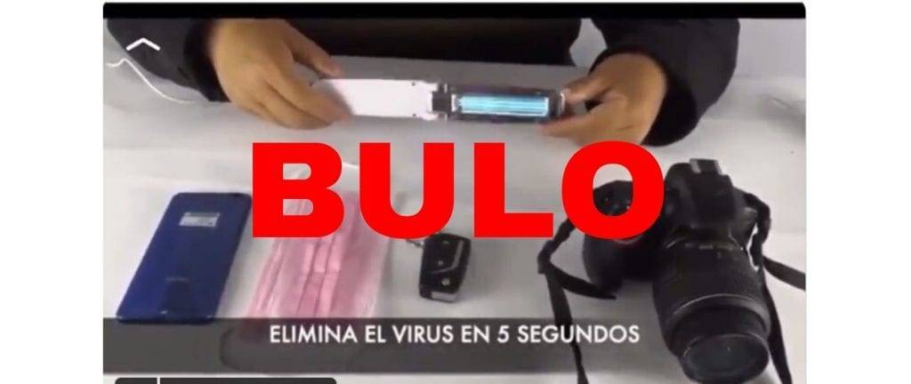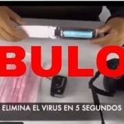 Circula un vídeo que muestra una lámpara portátil de luz ultravioleta como un producto que “elimina” el coronavirus “de tus dispositivos, mascarilla, teléfono” en cinco segundos. Pero es un bulo. La luz ultravioleta que funciona contra los virus es la UV‑C, que debe actuar más de cinco segundos para que tenga efecto contra los virus y bacterias, y un mal uso de ella es perjudicial para nuestra salud.