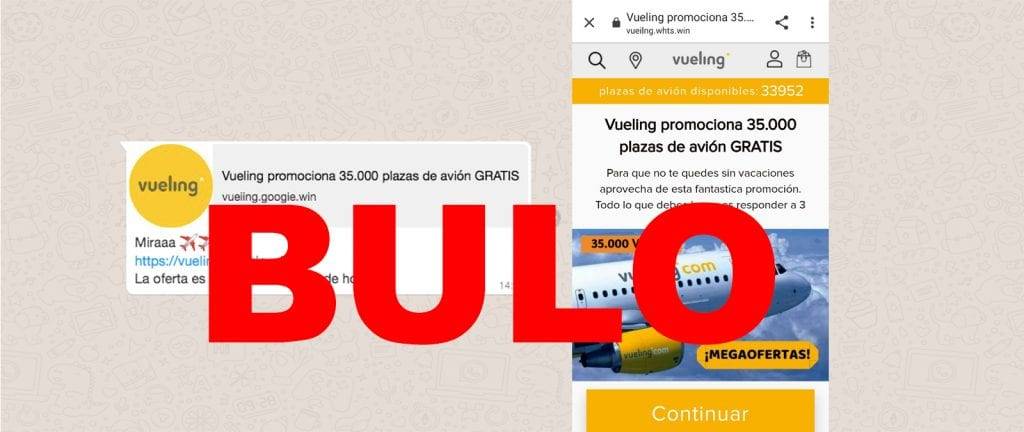 Nos habéis enviado una mensaje de WhatsApp que incluye un enlace a una supuesta promoción de Vueling de 35.000 plazas de avión gratis. Es un bulo, se trata de un caso de phishing, una técnica que utilizan timadores para intentar hacerse con tus datos personales.