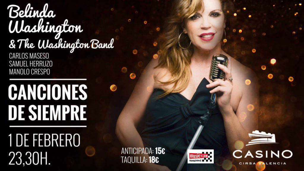 Casino Cirsa Valencia presenta el próximo viernes 1 a partir de las 23:30h en directo a The Washington Band en concierto, un cuarteto liderado por la actriz y famosa presentadora de TV Belinda Washington que se ha hecho un hueco en los escenarios interpretando grandes éxitos de blues, swing y jazz.