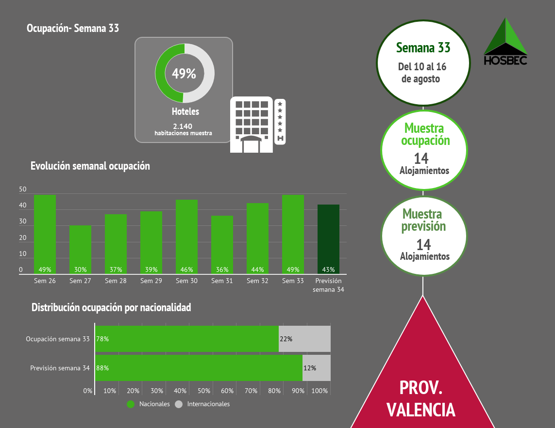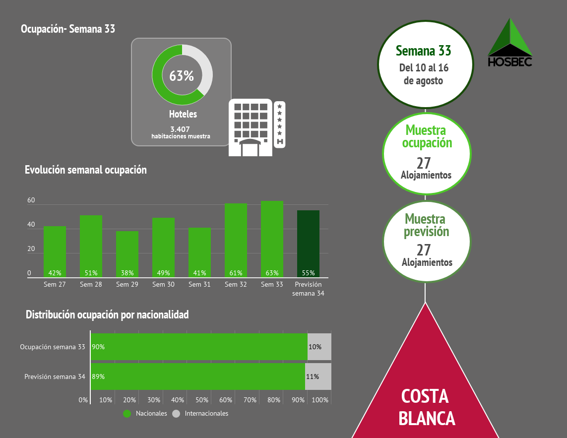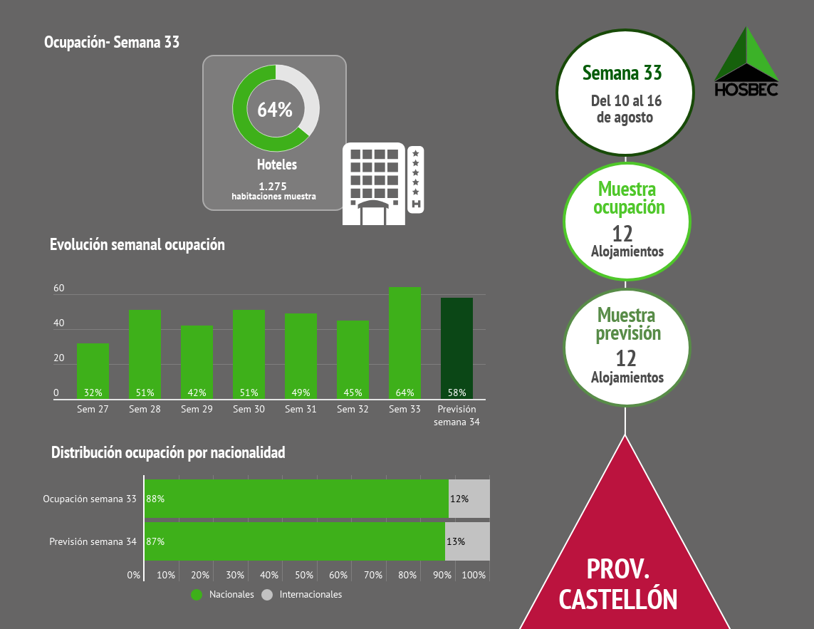 Según cifras de HOSBEC, la pro­vin­cia de Cas­te­llón ha regis­tra­do los mejo­res datos de ocu­pa­ción hote­le­ra de las áreas ana­li­za­das, con un 64% de ocu­pa­ción la pasa­da sema­na. Le sigue la pro­vin­cia de Ali­can­te, con un 63%. Mien­tras que Beni­dorm, que cuen­ta con datos de medi­ción pro­pia, alcan­zó un 59% de ocu­pa­ción media, y la pre­vi­sión para esta sema­na se encuen­tra en el 53%.