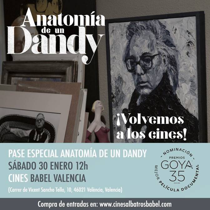 Anatomía de un Dandy, recientemente nominado a Mejor Documental en los Premios Goya, se estrena este sábado, día 30 de enero, a las 12 horas, en los Cines Babel de Valencia. Una emisión muy especial, pues llega justo antes del cierre temporal de estos cines por la pandemia del coronavirus, anunciado para el lunes, 1 de febrero. Por ello, cines Babel sortea, a través de Valencia City, 15 entradas dobles para poder asistir a este estreno.