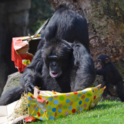 Poco antes de las 11:00 h de la mañana, el numeroso público se ha congregado en el área de chimpancés para asistir a esta “atípica” celebración y han podido ver cómo los cuidadores decoraban el recinto como si se tratara de una auténtica fiesta de cumpleaños. Así, guirnaldas, cajas de regalos, sorpresas y “golosinas” se han repartido por diferentes puntos y la enorme, llamativa y deliciosa tarta ha ocupado el lugar principal. Todo pensado y preparado para estimular al bebé y su familia, que con sus gritos mostraban su interés y se percataban de que era un día especial. Una iniciativa que ahonda en los cuidados para garantizar el máximo bienestar animal y que, además, supone una llamada de atención para las personas sobre la necesidad de proteger a estos grandes simios con los que compartimos un 97% de nuestro ADN.