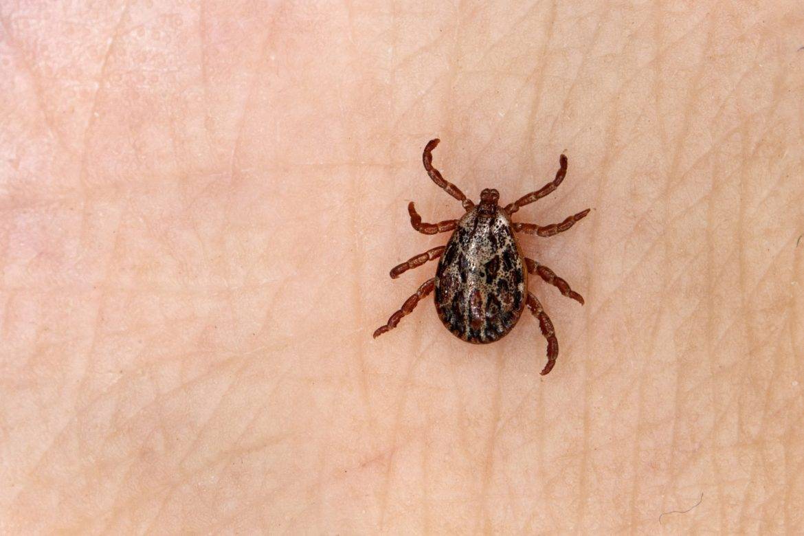 Ixo­did blood­suc­king tick on the hand. Walk in the park in spring. Dan­ge­rous insects.