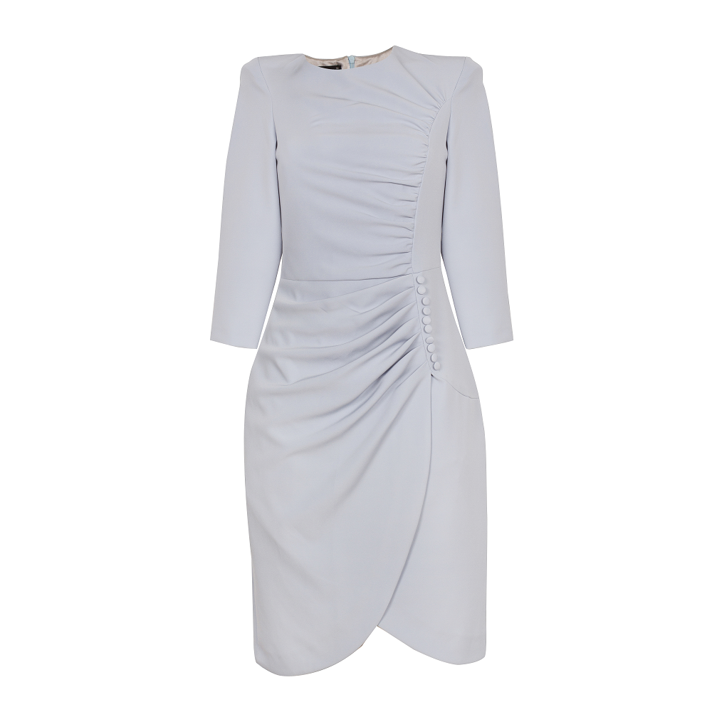Vestido Beth en azul cielo (229€), corto con manga francesa y cuerpo drapeado, para conseguir un entalle perfecto.