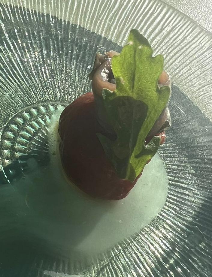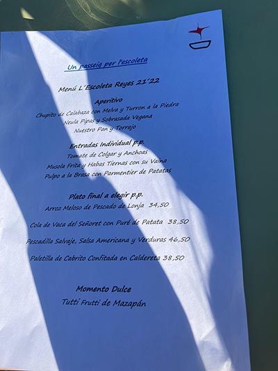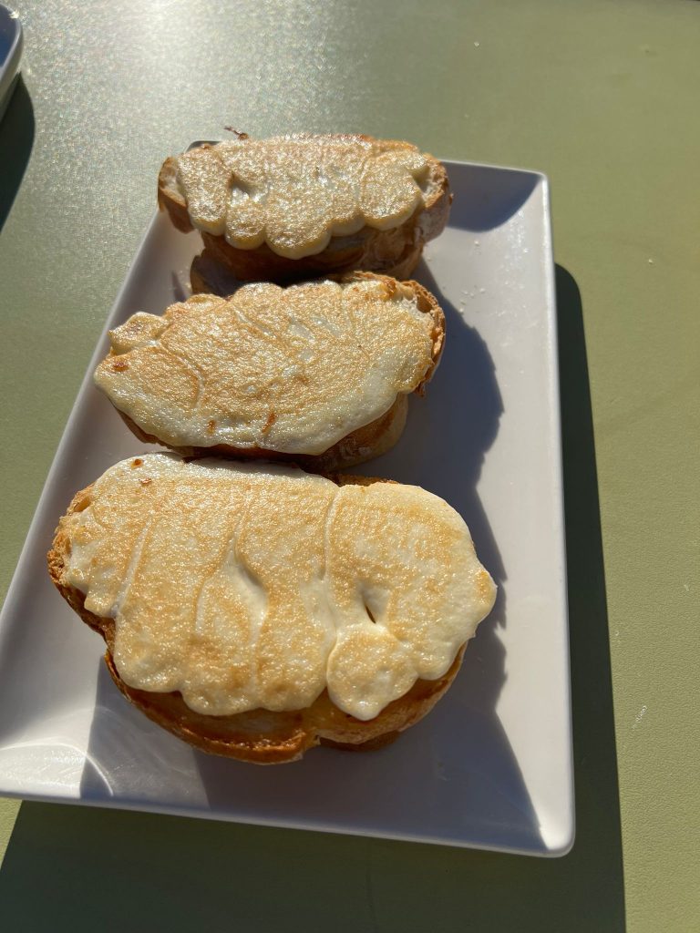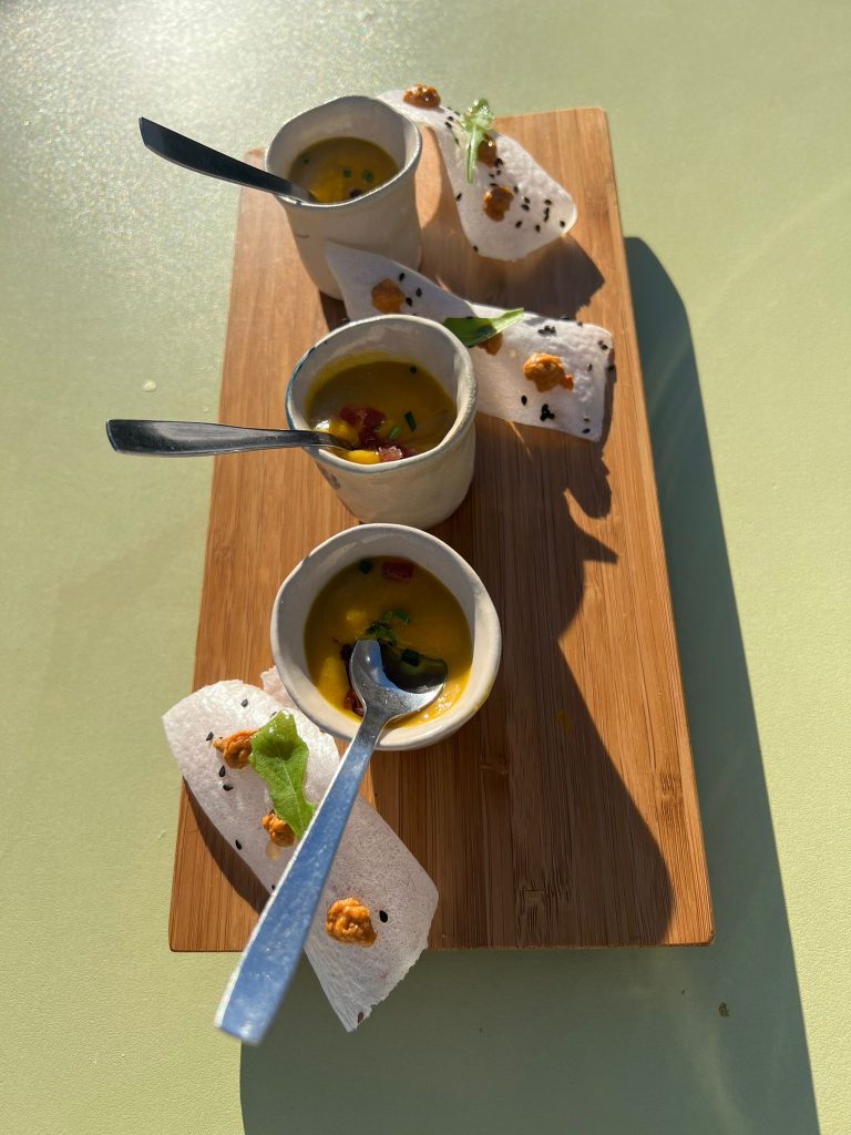 Empezamos con un vermú de Xaló y una serie de pequeños aperitivos preparados con primor, como un pequeño tomate de penjar, pelado y coronado por una ligera anchoa, un chupito de calabaza con melva, la neula finísima de pipas y sobrasada vegana… Y un clásico de este cocinero, el simplicísimo pan con alioli ligeramente tostado, lo que suaviza esta salsa y la transforma en un bocado superior.