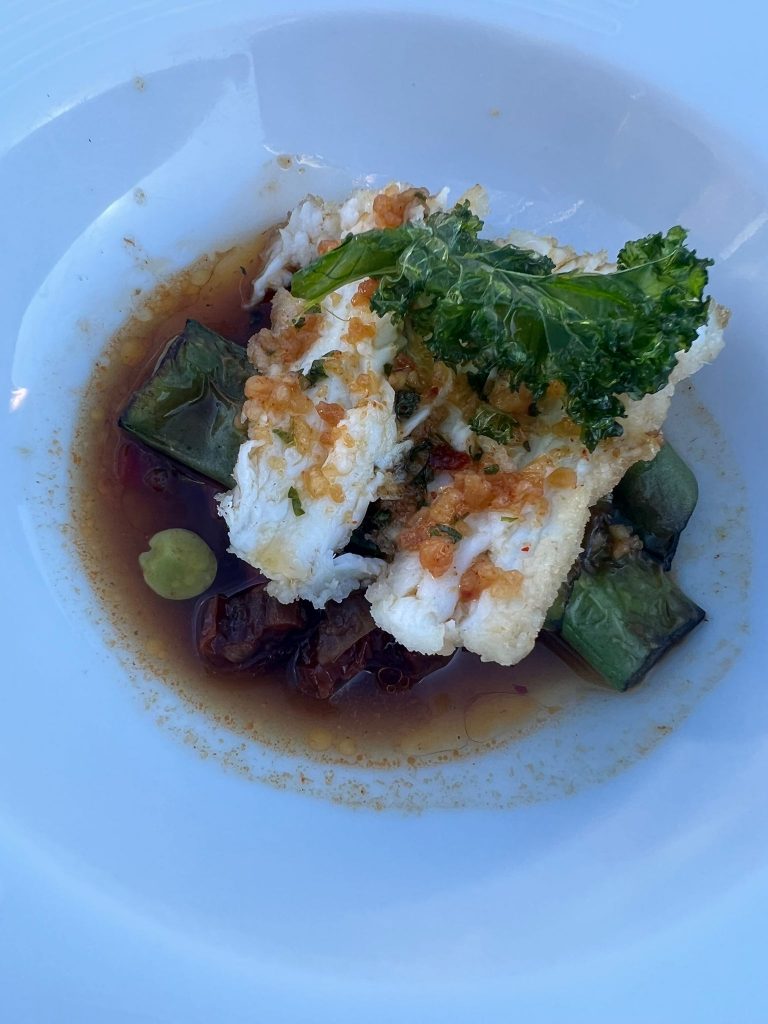 Llega entonces un plato sublime. El mejor y más sorprendente y nítido que he comido en los últimos meses. Una musola frita sobre una base con un caldo y una habas tiernísimas con su vaina cocida lo justo. La musola es el reconocido cazón andaluz, un pequeño tiburoncillo que se alimenta de crustáceos y tiene una textura parecida a la anguila y que se aprecia en tierras alicantinas. También las habitas, incluso crudas, son muy populares en las huertas del sureste, pero atreverse a darle una ligera cocción a las vainas es todo un descubrimiento, una maravilla de texturas vegetales que se corona con una hoja de kale refrito.