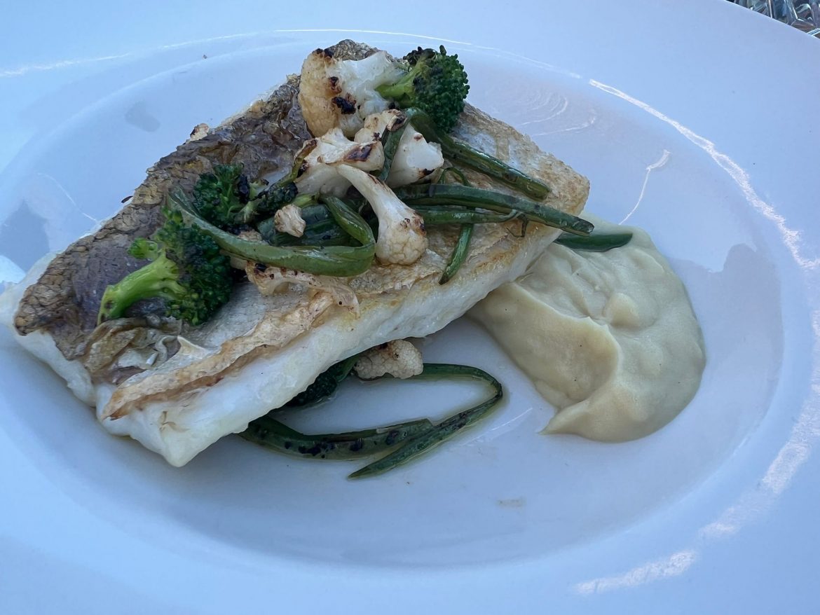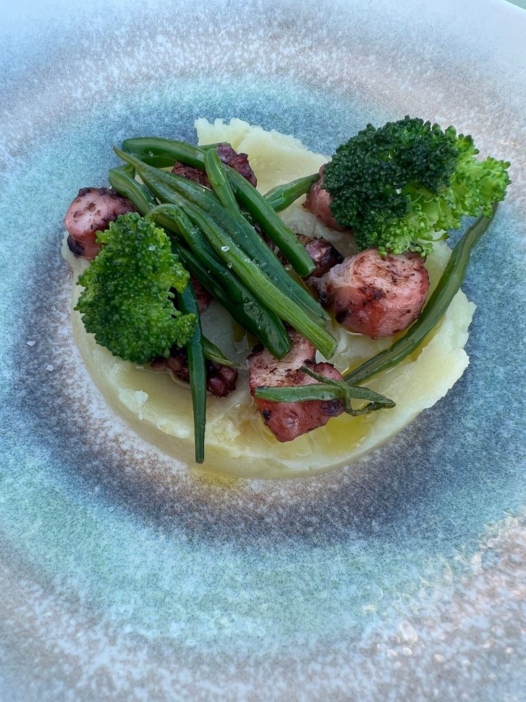 La comida sigue con un pulpo y su parmentier de patata, un presentación archiconocida que se resuelve con oficio, preámbulo para una serie de platos principales: Un arroz entre meloso y caldoso, también de musola, con verduras y patata, con un sabor de fondo limpísimo, por más que la reiteración del mismo pescado (tratado, eso sí, de modo muy diferente) reste interés al menú.