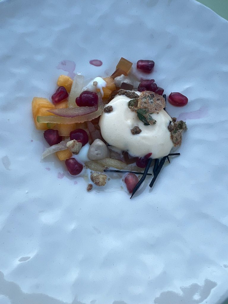 Estamos en la terraza, el sol del invierno está ya huyendo, el menú termina con un postre con una especie de macedonia de granada y otras frutas tropicales en brunoise, almendra amarga y un cremoso caliente. Un broche de compleja sencillez a la altura de una espléndida comida. Saludamos a Julio Vargas en su cocina. Es un hombre plácido, cuya determinación por reubicarse en este lugar apartado está cada día más clara.