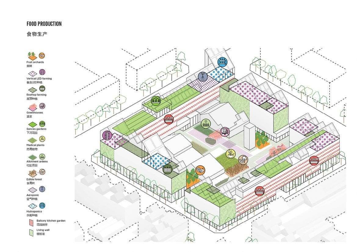 En con­cre­to, el con­jun­to está pen­sa­do para poder pro­du­cir ali­men­tos, ener­gía y tam­bién obje­tos de uso dia­rio a par­tir de la mini indus­tria digi­tal equi­pa­da con impre­so­ras de 3D situa­das en las plan­tas bajas. Asi­mis­mo, todos los blo­ques de vivien­das están cubier­tos por inver­na­de­ros que per­mi­ten pro­du­cir ali­men­tos para el con­su­mo dia­rio y uti­li­zan sus cubier­tas incli­na­das para pro­du­cir ener­gía.
