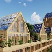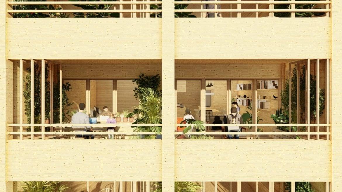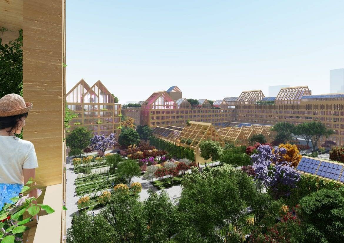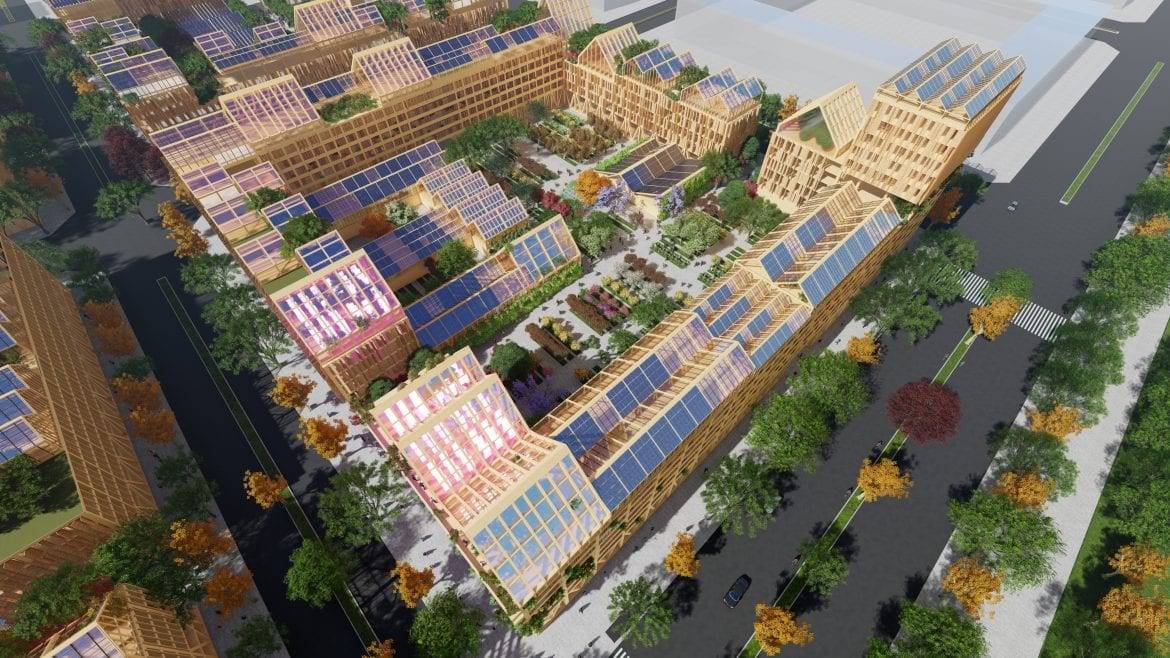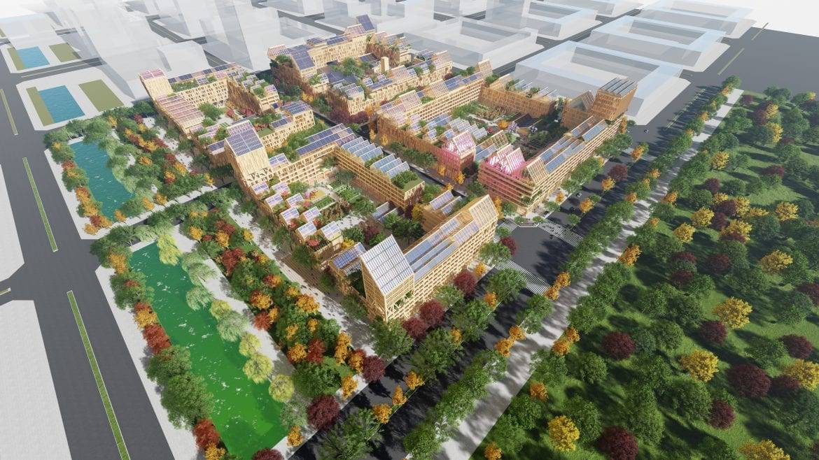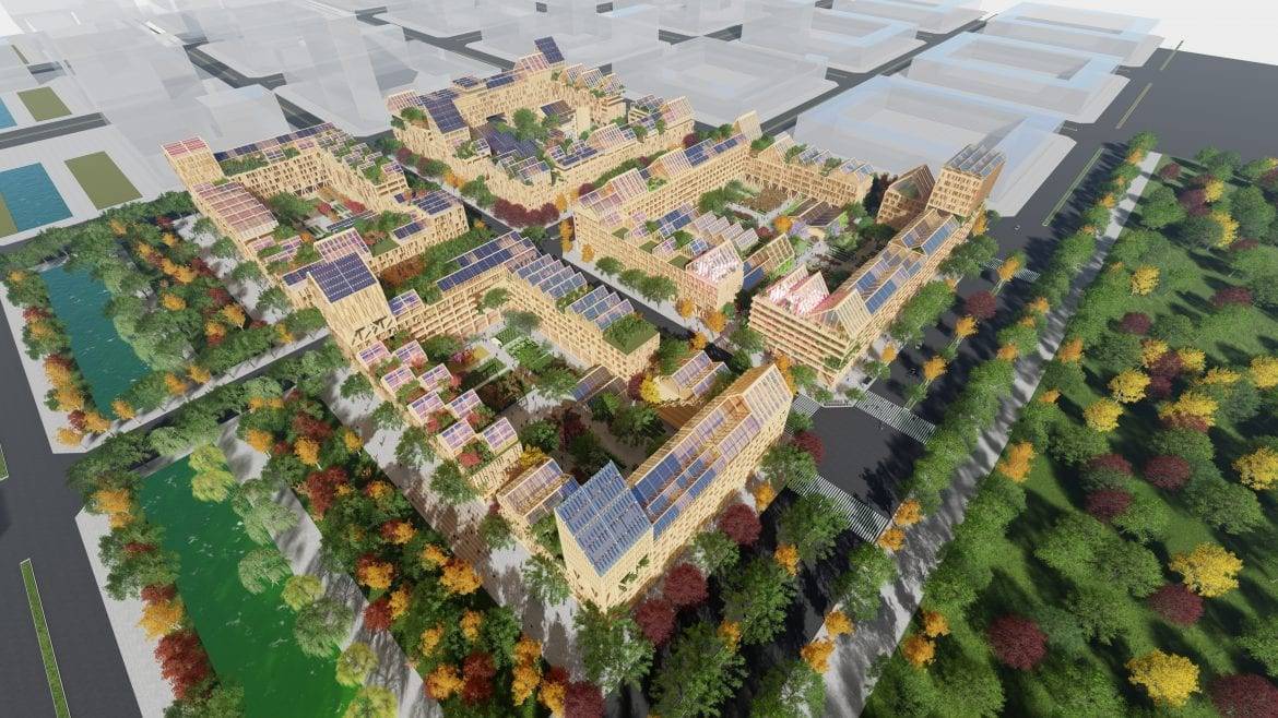 El con­jun­to de las cua­tro man­za­nas está cons­trui­do con edi­fi­cios de made­ra siguien­do prin­ci­pios de la nue­va bio­eco­no­mía cir­cu­lar y en ellos se mez­clan vivien­das, resi­den­cias de gen­te joven y mayo­res, ofi­ci­nas, una pis­ci­na públi­ca, tien­das, un mer­ca­do, guar­de­ría, un cen­tro admi­nis­tra­ti­vo y un par­que de bom­be­ros.