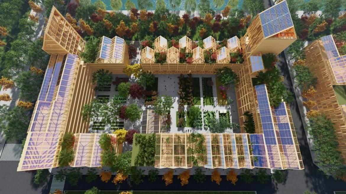 En con­cre­to, el con­jun­to está pen­sa­do para poder pro­du­cir ali­men­tos, ener­gía y tam­bién obje­tos de uso dia­rio a par­tir de la mini indus­tria digi­tal equi­pa­da con impre­so­ras de 3D situa­das en las plan­tas bajas. Asi­mis­mo, todos los blo­ques de vivien­das están cubier­tos por inver­na­de­ros que per­mi­ten pro­du­cir ali­men­tos para el con­su­mo dia­rio y uti­li­zan sus cubier­tas incli­na­das para pro­du­cir ener­gía.