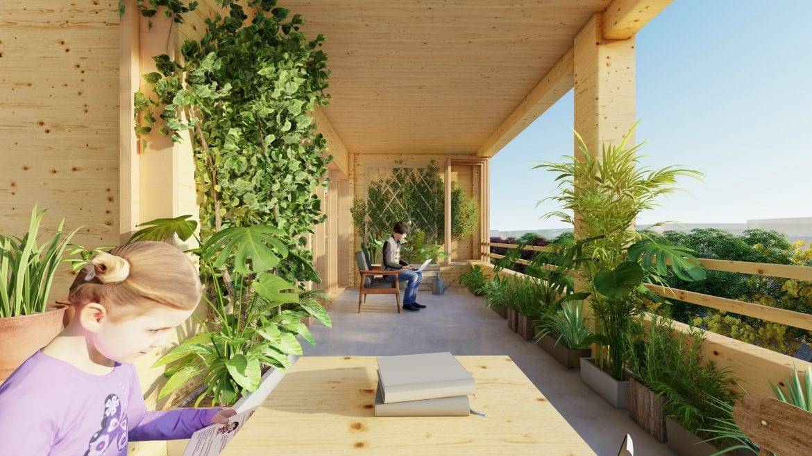 Todas las vivien­das cuen­tan con una amplia terra­za orien­ta­da al sur, que actúa como un regu­la­dor tér­mi­co, y es ade­más un espa­cio fun­da­men­tal en perio­dos de con­fi­na­mien­to y que per­mi­ten jugar y des­can­sar. Asi­mis­mo, las vivien­das están pre­pa­ra­das para tener espa­cios de tele­tra­ba­jo y están conec­ta­das con redes 5G, crean­do redes socia­les de esca­la de barrio para el inter­cam­bio de recur­sos.