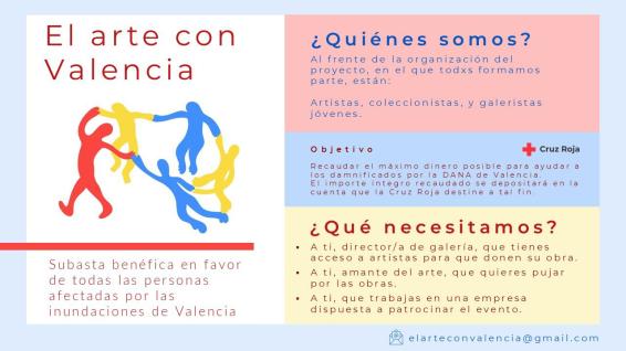 Desde “El arte con Valencia” quieren transmitir lo siguiente: “El proyecto consiste en la celebración de una subasta de arte, que tendrá lugar en Madrid, en una única sesión. Se subastarán obras artísticas de todo tipo. Iremos dando detalles al respecto. Todo el arte es bienvenido, pintura, escultura, literatura, cine, música… En este momento lo que necesitamos es máxima difusión para empezar a dar forma al proyecto y comenzar con el inventario para la confección del catálogo”.