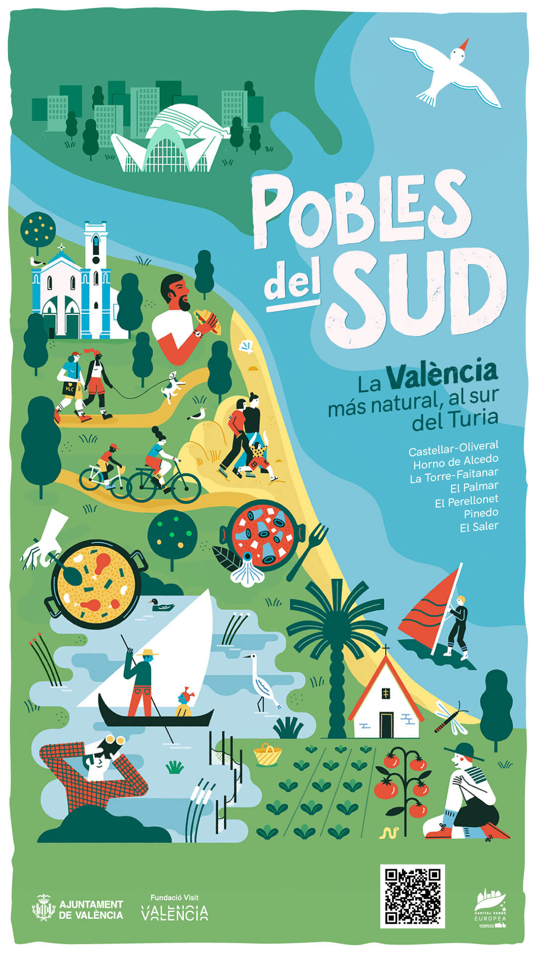 Bajo el lema ‘La Valèn­cia más natu­ral, al sur del Turia’, el Ayun­ta­mien­to de Valèn­cia, a tra­vés de la Fun­da­ción Visit Valèn­cia, ha pues­to en mar­cha la cam­pa­ña ‘Pobles del Sud’, una ini­cia­ti­va que bus­ca ani­mar tan­to a visi­tan­tes como a la ciu­da­da­nía local a redes­cu­brir y dis­fru­tar las peda­nías del sur, afec­ta­das en su momen­to por la DANA. La cam­pa­ña inclu­ye publi­ci­dad exte­rior y una acción en medios, con crea­ti­vi­da­des que invi­tan a des­cu­brir estos encla­ves úni­cos y que diri­gen a tra­vés de un QR a una lan­ding espe­cí­fi­ca en la web de la Fun­da­ción Visit Valèn­cia, don­de los usua­rios pue­den encon­trar infor­ma­ción prác­ti­ca sobre los luga­res, pla­nes y acti­vi­da­des más intere­san­tes que ofre­cen estas peda­nías.