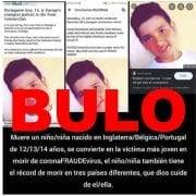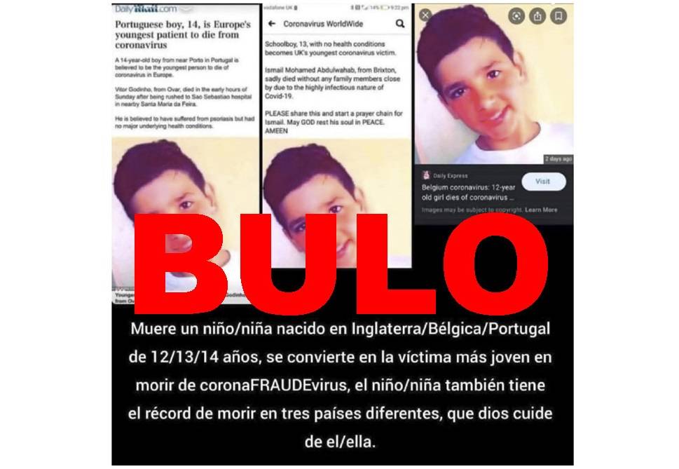 La segunda captura que incluyen en el montaje es de una publicación de Facebook que incluye la fotografía del niño junto con un titular, un subtítulo y otra frase que pide difusión por la muerte de otro menor fallecido a los 13 años en Reino Unido por coronavirus.