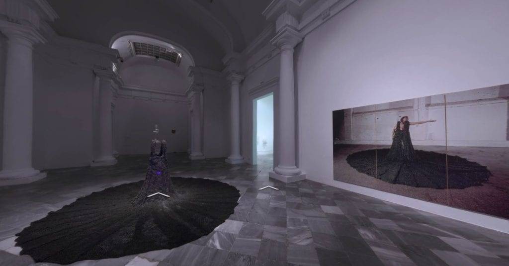 Esta trilogía está todavía en proceso, ya que Domènech aún sigue trabajando en la tercera pieza dedicada al futuro y para la que cada día teje un metro. Según la artista, que reconoce que estos vestidos pueden llegar a pesar en torno a los 200 kilos “empecé a tejer estas piezas como una forma de proteger los cuerpos, su intimidad y su identidad”. La exposición incluye varias instalaciones inéditas realizadas ex professo para el Centre del Carme como Seguimos de luto y con rabia.