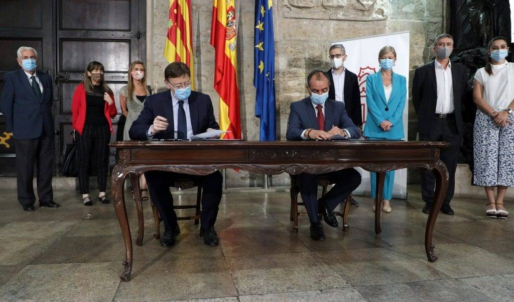 El president de la Generalitat, Ximo Puig, ha formalizado con el presidente de la Confederación Empresarial de la Comunitat Valenciana, Salvador Navarro, un convenio para poner en marcha el Plan Agiliza que, entre otros objetivos, pretende reducir un 30 por ciento los trámites administrativos de las empresas y ayudar así a reactivar la economía valenciana.