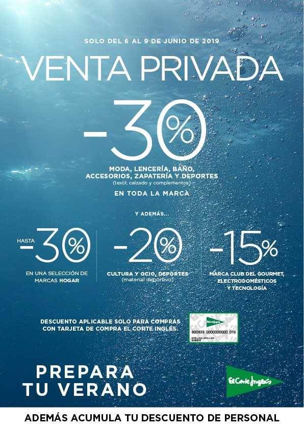 El Cor­te Inglés calien­ta moto­res para las reba­jas y para ello lan­za su ya míti­ca acción “Ven­tas Pri­va­das” que, en esta oca­sión y por pri­me­ra vez, se amplía a todas las áreas de ven­ta. Del 6 al 9 de junio la com­pa­ñía pro­po­ne más de 1.000 mar­cas a pre­cios muy atrac­ti­vos y con des­cuen­tos de has­ta el 30%.