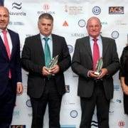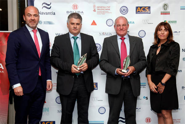 El catamarán Eco Aqua ha sido galardonado como la construcción naval más destacada de 2017 por la Asociación de Ingenieros Navales y Oceánicos de España. Guillermo Alomar, director de Flota de Baleària, recibió el galardón acompañado de Antonio Pacheco Etchevers, director de la división de fibra del astillero constructor del buque, Gondán, en el marco del 57º Congreso de Ingeniería Naval e Industria Marítima que se celebra en València, y cuya conferencia inaugural el miércoles fue a cargo del presidente de Baleària, Adolfo Utor.