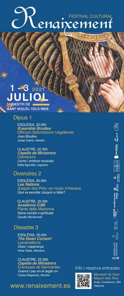 La Fun­da­ción Cul­tu­ral CdM (FCCdM) y Lica­nus orga­ni­zan el fes­ti­val en cola­bo­ra­ción con la direc­ción gene­ral de Cul­tu­ra y Patri­mo­nio de la Gene­ra­li­tat Valen­cia­na y las sub­di­rec­cio­nes gene­ra­les de Patri­mo­nio Cul­tu­ral y Museos y del Libro, Archi­vos y Biblio­te­cas. Para los con­cier­tos, que per­mi­ti­rán dis­fru­tar de la rique­za de las expre­sio­nes artís­ti­cas y musi­ca­les más sig­ni­fi­ca­ti­vas del Rena­ci­mien­to, se reco­mien­da reser­var con ante­la­ción en la pági­na web www.renaixement.es.