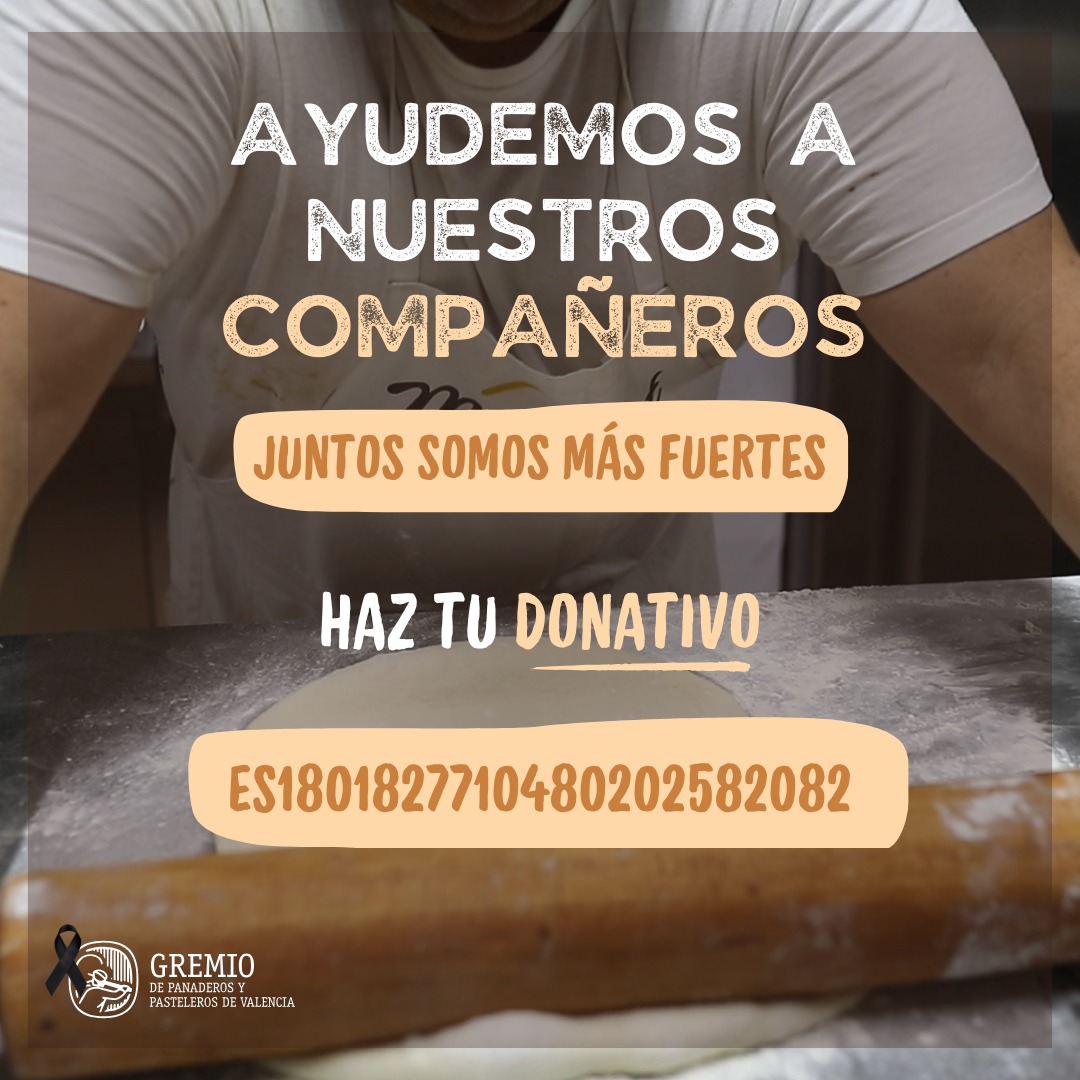 Por este motivo, el Gremio de Panaderos y Pasteleros de Valencia ha puesto en marcha una campaña de donaciones para ayudar a los hornos y pastelerías de la provincia afectados por la DANA con el objetivo de que estos puedan recuperarse y retomar su actividad lo antes posible. Para ello, el Gremio ha habilitado la cuenta bancaria BBVA-ES18 0182 7710 48 0202582082 dirigida exclusivamente a canalizar las donaciones de personas y entidades solidarias y cuyo fondo estará destinado a apoyar tanto a los establecimientos panaderos y pasteleros agremiados, como al resto de establecimientos afectados de la provincia, ayudándoles a reponer maquinaria y equipos esenciales para la elaboración de productos de panadería y pastelería, así como a reparar los locales dañados y volver a abrir sus puertas al público.