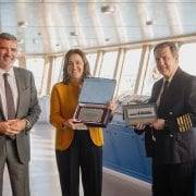De izquierda a derecha, el presidente de Baleària, Adolfo Utor, la presidenta del Port de Barcelona, Mercè Conesa, y el capitán del ‘Hypatia de Alejandría’, Pedro Puertas.